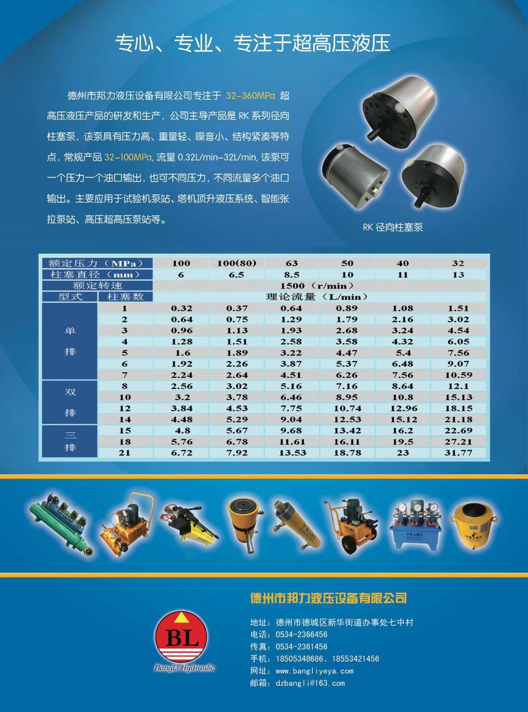 RK系列徑向柱塞泵,是德州市邦力液壓設(shè)備有限公司的主導(dǎo)產(chǎn)品,技術(shù)先進,性能優(yōu)良,最高工作壓力為100MPa,具有壽命長、效率高、自吸性能好,體積小、重量輕、結(jié)構(gòu)簡單、規(guī)格齊全、操作方便等特點。
